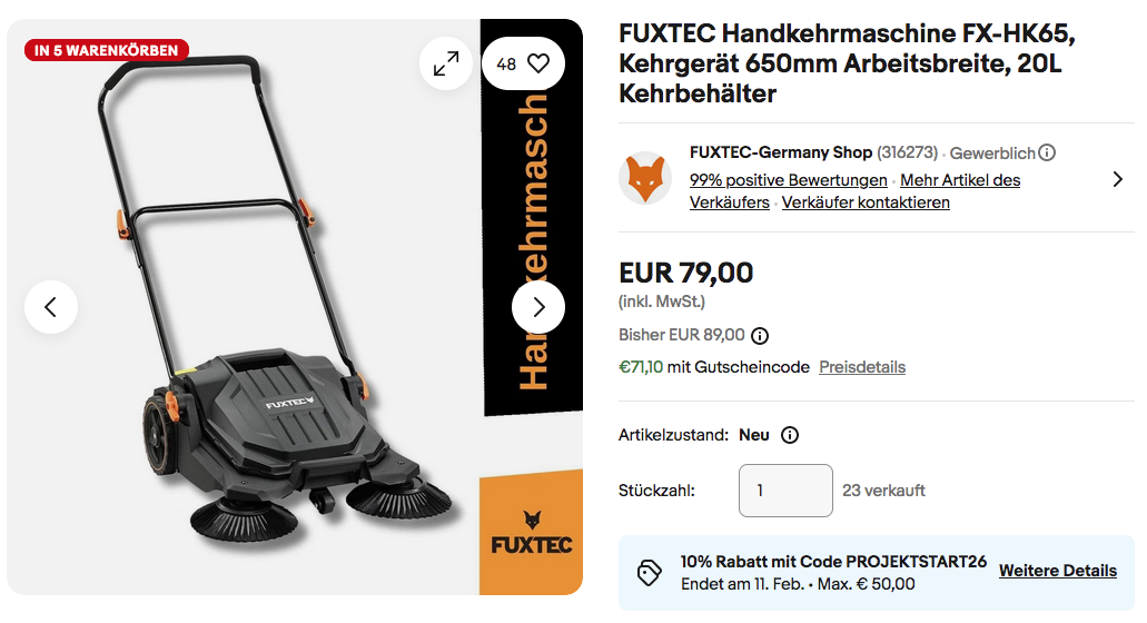 Die FUXTEC Handkehrmaschine FX-HK65 NEU&OVP bekommt man im Laufe dieser Aktion für 71,10€ inkl. Versand.