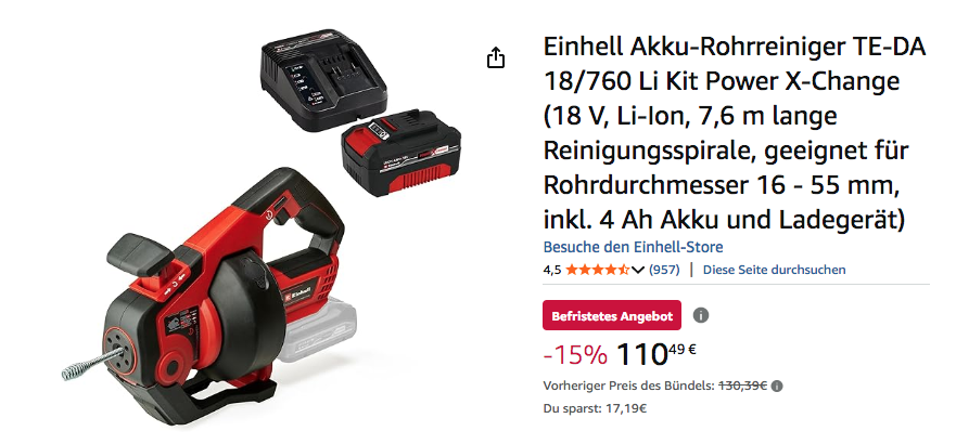 Amazon bietet aktuell das Einhell Akku-Rohrreiniger TE-DA 18/760 Li Kit für 110,49€ an, solange der Vorrat reicht.