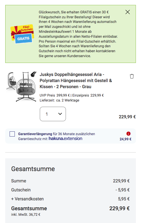 Den Juskys Doppelhängesessel Aria in Grau bekommt man im Laufe dieser Aktion für 229,99€ inkl. Versand und 30€ Filial-Gutschein gratis dazu.