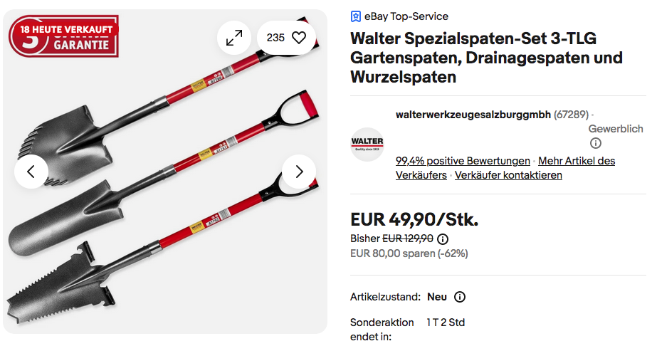 Walterwerkzeugesalzburggmbh bietet aktuell bei eBay das Walter 3-tlg. Spezialspaten-Set (Gartenspaten, Drainagespaten und Wurzelspaten) NEU&OVP für 49,90€ inkl. Versand an, solange der Vorrat reicht.