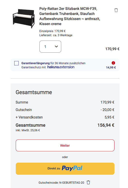 Die MCW-F39 Poly-Rattan 2er Sitzbank mit Staufach in Anthrazit/Creme bekommt man im Laufe dieser Aktion für 150,99€ zzgl. 5,95€ Versand.