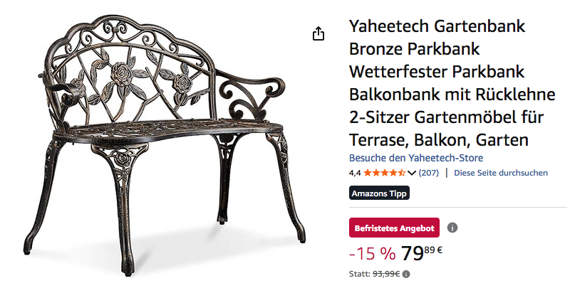 Amazon bietet aktuell die Yaheetech 99,5 cm Metall Gartenbank mit Rosenmuster in Bronze für 79,89€ an, solange der Vorrat reicht.