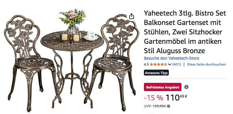 Amazon bietet aktuell das Yaheetech 3tlg. Metall Balkonset mit Blumenmuster in Bronze für 110,49€ an, solange der Vorrat reicht.