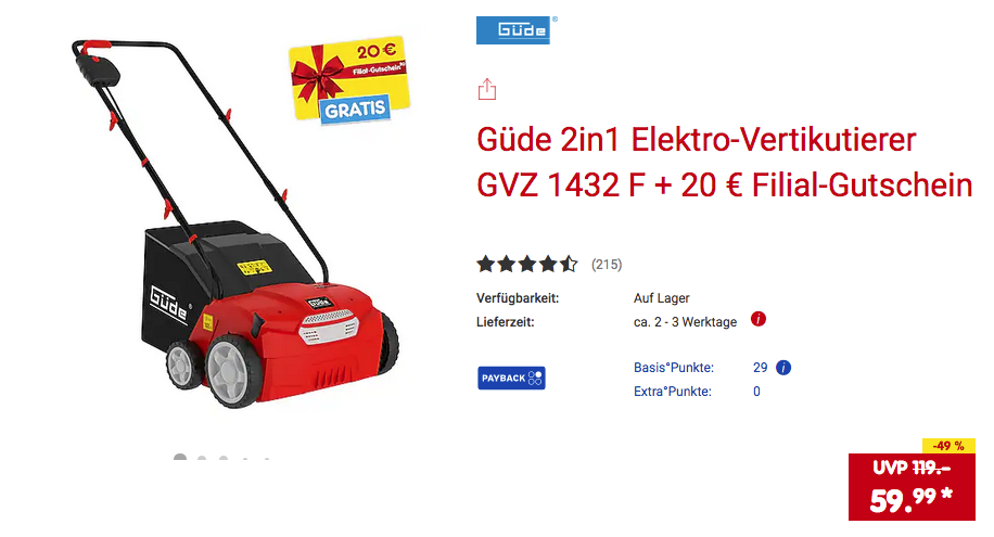 Den Güde 2in1 Elektro-Vertikutierer GVZ 1432 F bekommt man im Laufe dieser Aktion für 59,99€ zzgl. 5,95€ Versand und 20€ Filial-Gutschein gratis dazu.