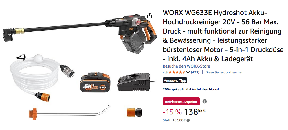 Amazon bietet aktuell den WORX WG633E Hydroshot Akku-Hochdruckreiniger inkl. 4Ah Akku & Ladegerät für 138,55€ an, solange der Vorrat reicht.