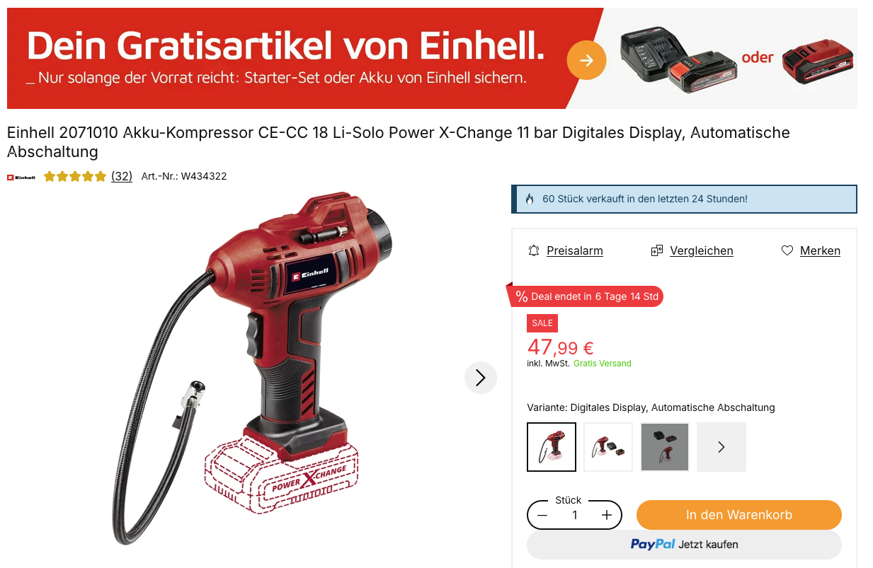 Den Einhell 2071010 Akku-Kompressor CE-CC 18 Li-Solo inklusive Einhell PXC Starter Kit 18 V 2,5 Ah bekommt man im Laufe dieser Aktion für 47,99€ inkl. Versand.