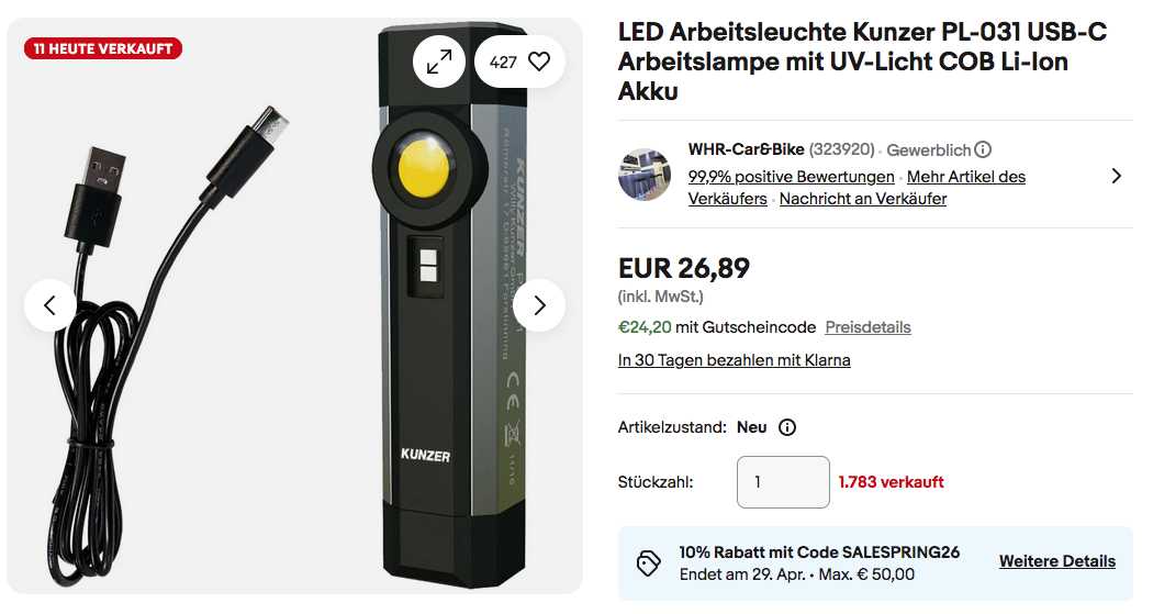 Die Kunzer PL-031 Arbeitslampe NEU&OVP bekommt man im Laufe dieser Aktion für 24,20€ inkl. Versand.