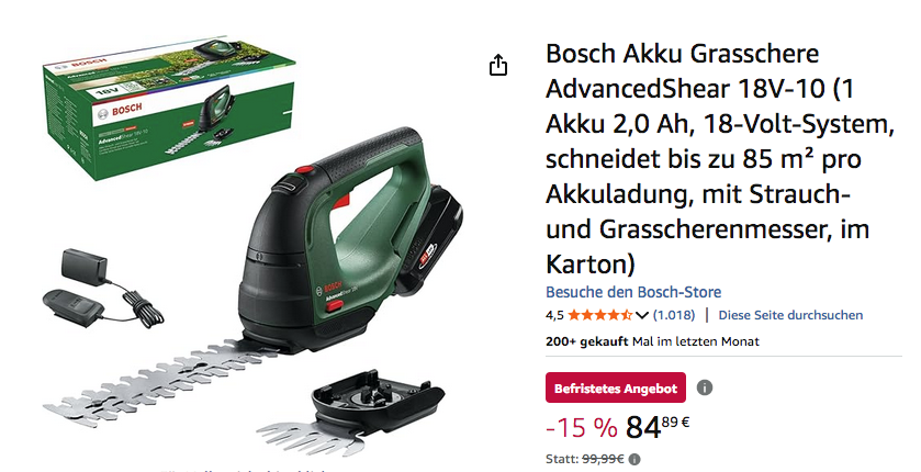 Amazon bietet aktuell die Bosch Akku-Grasschere AdvancedShear 18V-10 mit 2,0 Ah Akku für 84,89€ an, solange der Vorrat reicht.
