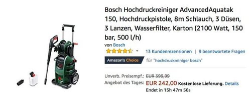 Amazon bietet heute, 27.08.18, ausgewählte Bosch Gartenartikel billiger an, solange der Vorrat reicht. Den Bosch AdvancedAquatak 150 Hochdruckreiniger bekommt man im Laufe dieser Aktion für 242€. Hochleistungspumpe mit 4 Zylindern Sicheres und effizientes Arbeiten durch das Bosch Auto-Stopp-System Motoreistung: 2200 Watt Fördermenge: max. 500 l/h Druck: max. 150 bar Lieferumfang: AdvancedAquatak 150, Bosch Metall-Pistole, Fixe Hochdruckdüse, Höhenverstellbare Hochdrucklanze, Rotodüse, Standardlanze, Hochdruck-Schaumdüse mit Regler, 8m Schlauch Dieser leistungsstarke Hochdruckreiniger wurde von Amazon Kunden mit sehr guten 4,4 Sternen benotet (13 Kundenrezensionen).Ein Hochdruckreiniger löst mit einem hohen Wasserdruck hartnäckige Verschmutzungen und erleichtert damit das Säubern von Flächen, Maschinen und Fahrzeugen.