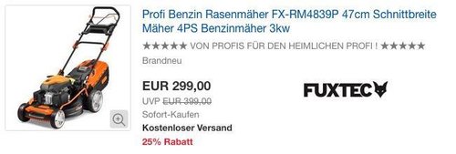 Bei eBay werden bis 30.8.2018, 8:59 Uhr ausgewählte FUXTEC Gartengeräte billiger angeboten. Den Profi Benzin Rasenmäher FX-RM4839P NEU&OVP bekommt man im Laufe dieser Aktion für 299€ inkl. Versand, solange der Vorrat reicht. 4in1 - Mähen, Fangen, Mulchen und Seitenauswurf Zentrale 7-stufige Schnitthöhenverstellung 25-70mm 47cm Schnittbreite Verfügt über ein Selbstantriebssystem mit "original GT-Getriebe" Fangkorb fasst 60 l und lässt sich bequem abnehmen Kugelgelagerte Big Wheel Räder 255 mm hinten und 175 mm vorne