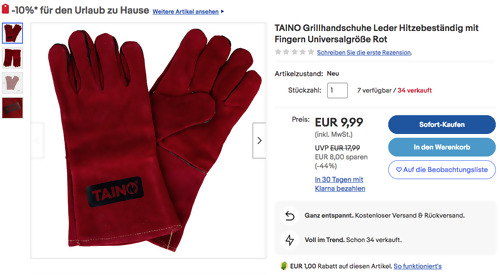 Dank dem Gutscheincode: SONNIG23 (zur Kasse gehen und dort einlösen) bekommt man bei eBay bis zum 28.06.2023 einen 10% Rabatt (2x einlösbar und max. 50€) auf Garten & Terrasse, solange der Vorrat reicht. Die TAINO Leder Grillhandschuhe in Rot NEU&OVP bekommt man im Laufe dieser Aktion für 8,99€ inkl. Versand an, solange der Vorrat reicht. 1 Paar Grillhandschuhe Feuerfest bis 800 Grad Material Außen: Echtleder Material Innen: Baumwolle Farbe: Rot Universalgröße - für Männer und Frauen geeignet Diese bequemen Grillhandschuhe/Kaminhandschuhe wurden von Amazon Kunden mit sehr guten 4,8 Sternen benotet (19 Sternebewertungen).