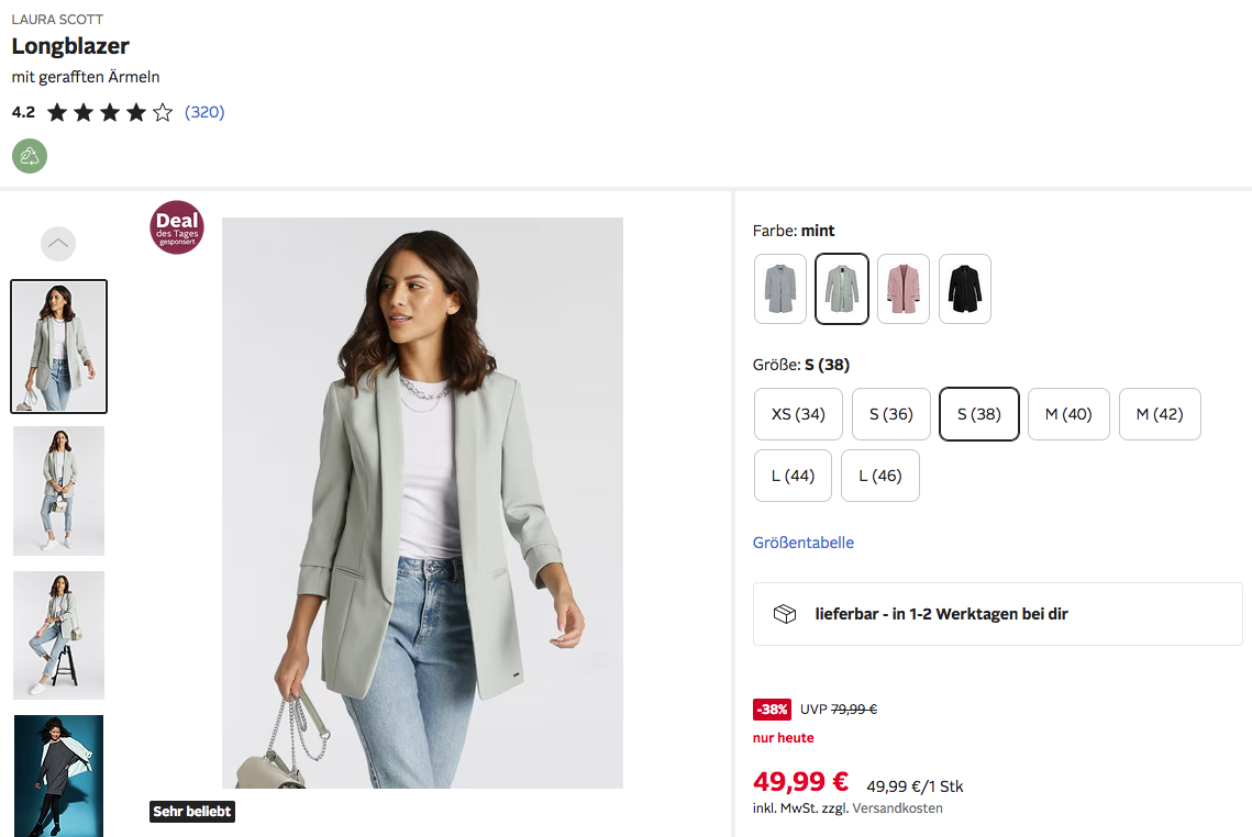 Otto.de bietet heute, 27.08.25, als Deal des Tages den LAURA SCOTT Longblazer mit gerafften Ärmeln in versch. Farben und Größen (34-46) für 49,99€ zzgl. 4,95€ Versand an, solange der Vorrat reicht.