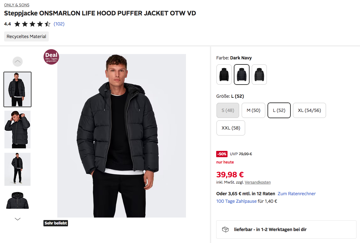 Otto.de bietet heute, 11.11.25, als Deal des Tages die ONLY & SONS Herren Steppjacke ONSMARLON LIFE HOOD PUFFER JACKET OTW VD in Dark Navy oder Grey Pinstripe und in Größen S - XXL für 39,98€ zzgl. 4,95€ Versand an, solange der Vorrat reicht.