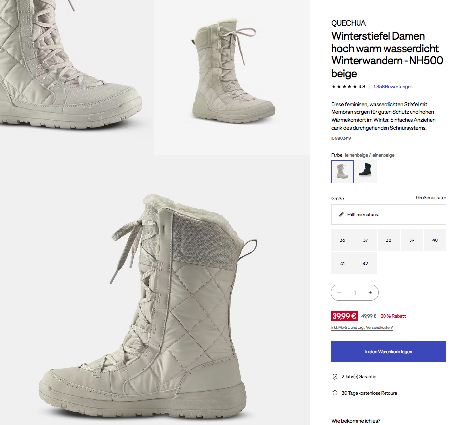 Die QUECHUA Winterstiefel Damen hoch warm wasserdicht Winterwandern - NH500 beige oder grün in Größen 36 - 42 bekommt man im Laufe dieser Aktion für 39,99€ zzgl. 4,99€ Versand, Filialabholung ist versandkostenfrei