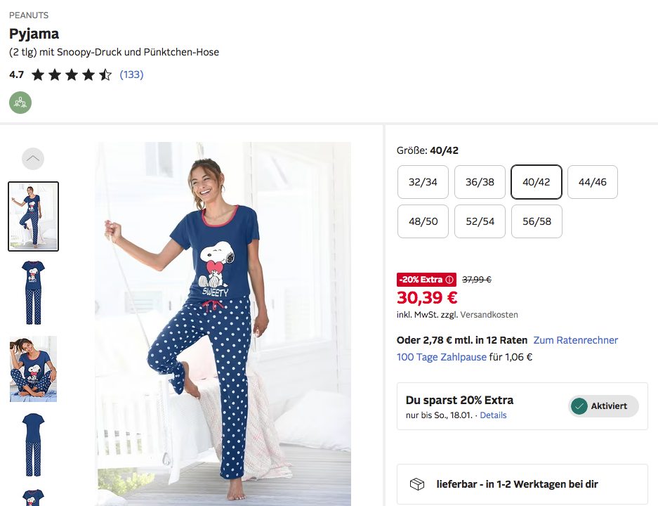 Den PEANUTS 2-tlg. Pyjama mit Snoopy-Druck und Pünktchen-Hose in Größen 40/42 oder 44/46 bekommt man im Laufe dieser Aktion für 30,39€ zzgl. 4,95€ Versand.