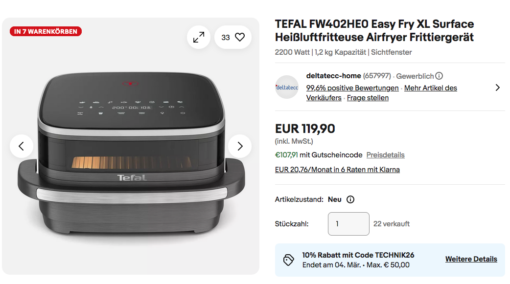 Dank dem Gutscheincode: TECHNIK26 (10% Rabatt auf ausgewählte Elektronik & Haushaltsgeräte) bekommt man diese Heißluftfritteuse für 107,91€ inkl. Versand.