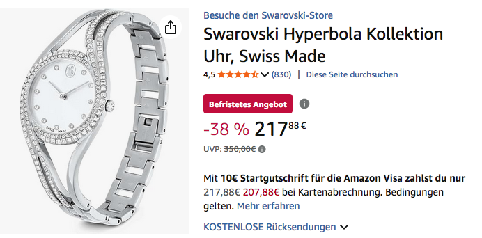 Amazon bietet aktuell die Swarovski 5689432 Hyperbola Kollektion Uhr in Silberton für 217,88€ an, solange der Vorrat reicht.