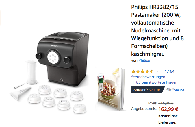 Den Philips HR2382/15 Pastamaker inkl. 8 Formscheiben bekommt man im Laufe dieser Aktion für 162,99€.