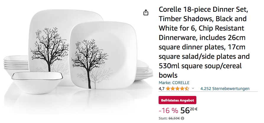 Amazon bietet aktuell das Corelle 18-teilige Geschirr-Set Timber Shadows in Schwarz/Weiß für 56,20€ an, solange der Vorrat reicht.