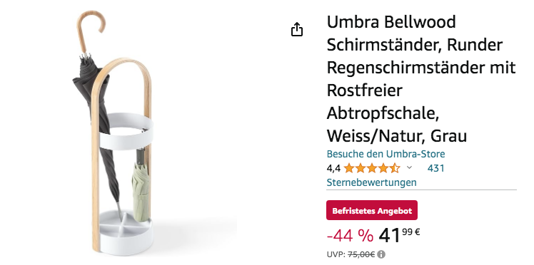 Amazon Kunden haben diesen dezenten Regenschirmständer mit sehr guten 4,4 Sternen benotet (431 Sternebewertungen).