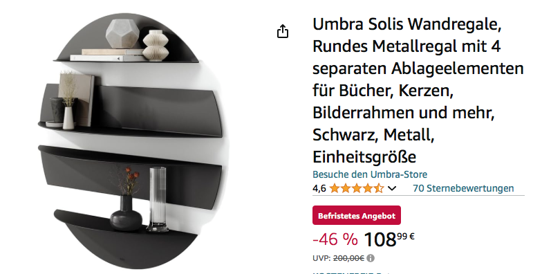 Amazon bietet aktuell das Umbra Regal "Solis" in Schwarz für 108,99€ an, solange der Vorrat reicht.