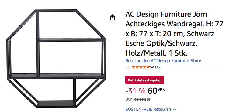Amazon bietet aktuell das AC Design Furniture 89690 Wandregal in Schwarz Esche für 60,99€ an, solange der Vorrat reicht.