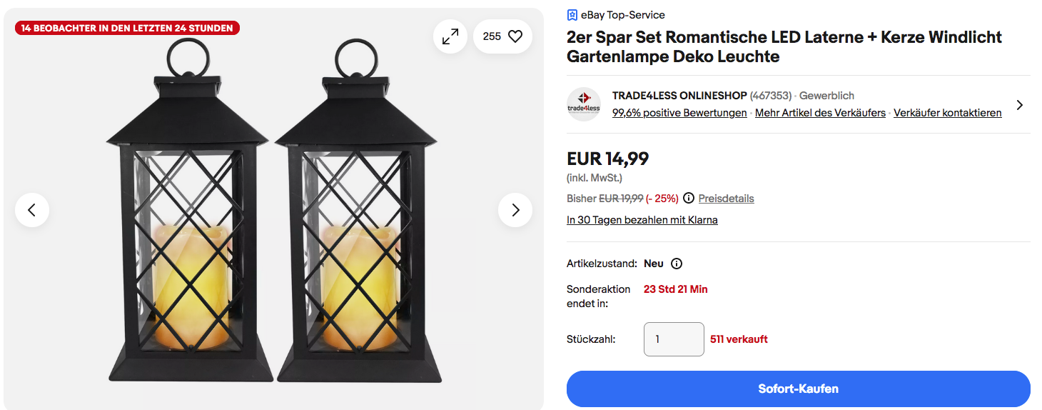 TRADE4LESS ONLINESHOP bietet aktuell bei eBay das Eaxus 2er Set Romantische LED Laterne NEU&OVP für 14,99€ inkl. Versand an, solange der Vorrat reicht.