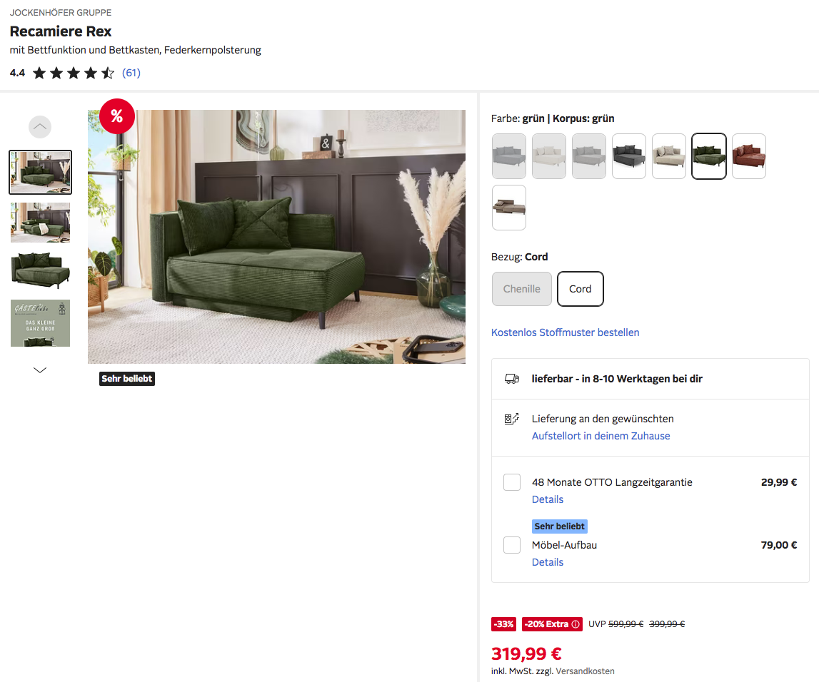 Die Jockenhöfer Recamiere Rex in Grün bekommt man im Laufe dieser Aktion für 319,99€ zzgl. 39,95€ Versand.