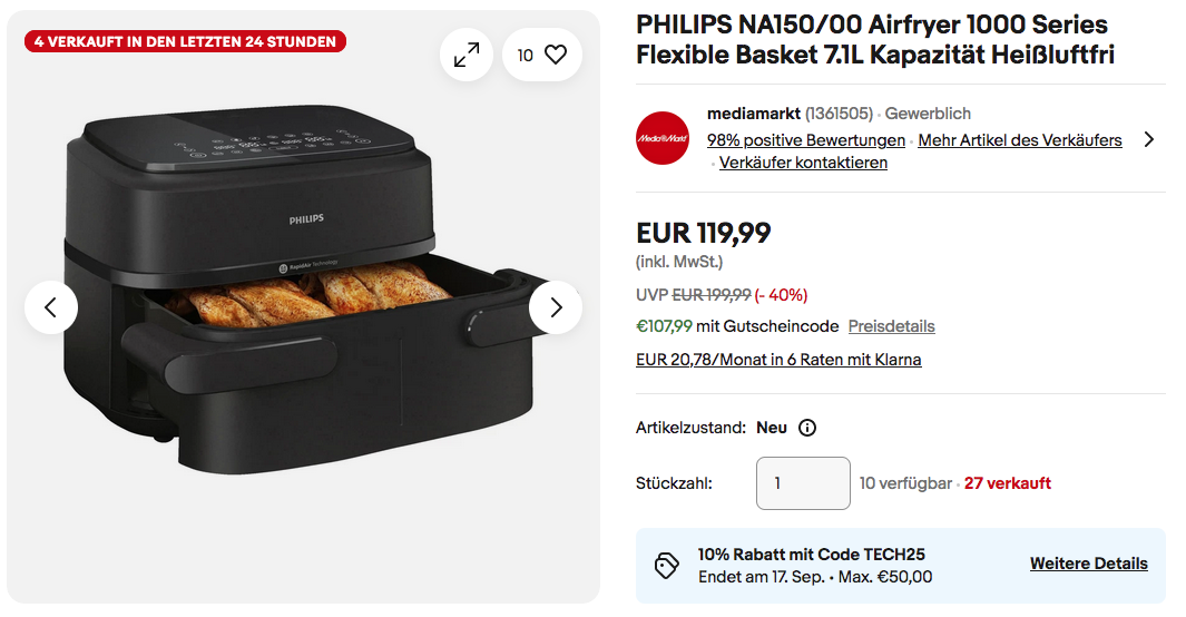 Dank dem Gutscheincode: TECH25 (zur Kasse gehen und dort einlösen) bekommt man bei eBay bis zum 17.9.2025 einen 10% Rabatt (2x einlösbar und max. 50€) auf ausgewählte Technik, solange der Vorrat reicht.