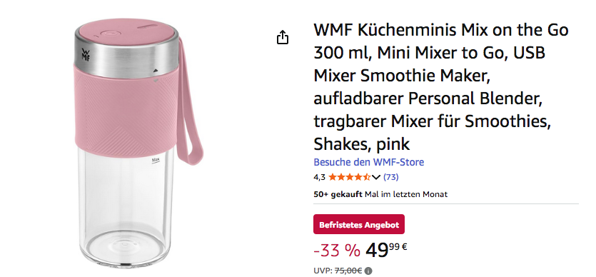 Amazon bietet aktuell den WMF Küchenminis 300 ml Mix on the Go Mixer in Pink für 49,99€ an, solange der Vorrat reicht.
