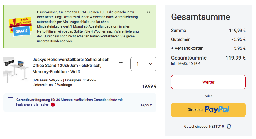 Netto Marken-Discount Onlineshop bietet bis 05.10.2025 mit dem Gutscheincode: NETTO10 einen 10€ Netto Marken-Discount Filial-Gutschein gratis auf ausgewählte Artikel an, gilt ab einem Mindestbestellwert von 100 € und solange der Vorrat reicht.