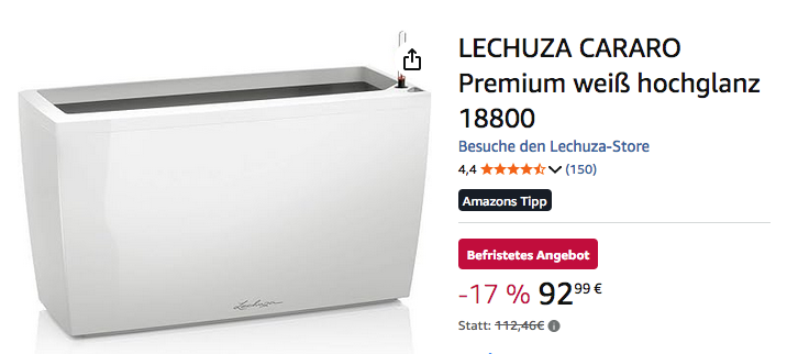 Amazon bietet aktuell das LECHUZA CARARO 18800 Premium weiß hochglanz Pflanzgefäß für 92,99€ an, solange der Vorrat reicht.