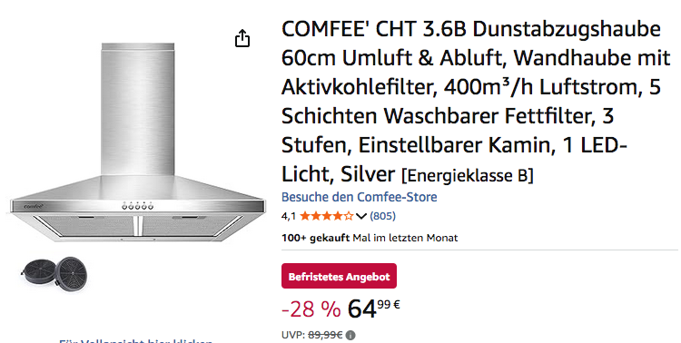 Amazon bietet aktuell die Comfee' CHT 3.6B Dunstabzugshaube 60 cm in Edelstahl Silber für 64,99€ an, solange der Vorrat reicht.