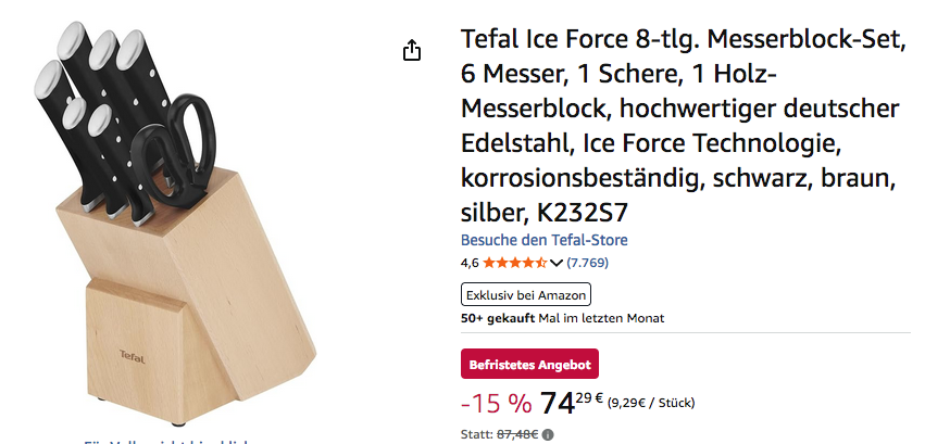 Amazon bietet aktuell das Tefal K232S7 Ice Force 8-tlg. Messerblock-Set für 74,29€ an, solange der Vorrat reicht.