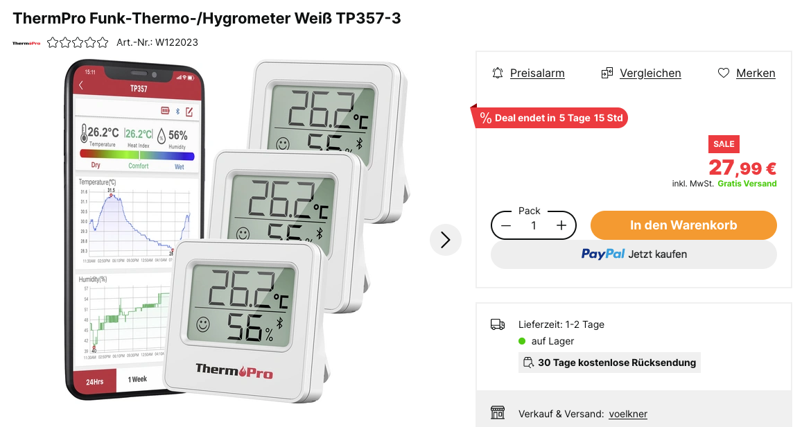 Den ThermPro Funk-Thermo-/Hygrometer Weiß TP357-3 3er Pack bekommt man im Laufe dieser Aktion für 27,99€ inkl. Versand.