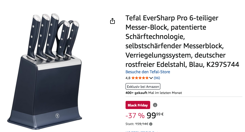Den Tefal K297S744 EverSharp Pro 6-tlg. Messer-Block in Blau bekommt man im Laufe dieser Aktion für 99,99€.