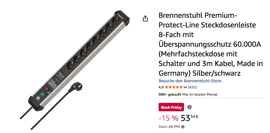 Amazon Kunden haben diese hochwertige Steckdosenleiste mit 4,8 Sternen benotet (432 Bewertungen).