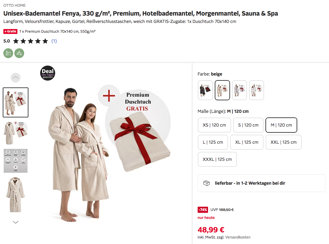 Otto.de bietet heute, 01.12.25, als Deal des Tages den OTTO HOME 330 g/m² Unisex-Bademantel Fenya XS - M inkl. 550g/m² Premium Duschtuch 70x140 cm in verschiedenen Farben für 48,99€ zzgl. 4,95€ Versand an, solange der Vorrat reicht.