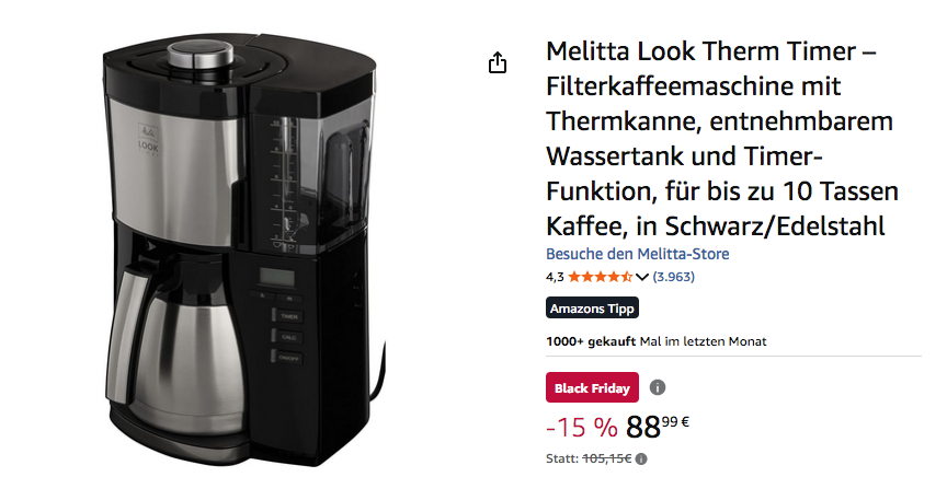 Die Melitta Look Therm Timer 1025-18 Filterkaffeemaschine mit Thermkanne in Schwarz/Edelstahl bekommt man im Laufe dieser Aktion für 88,99€.