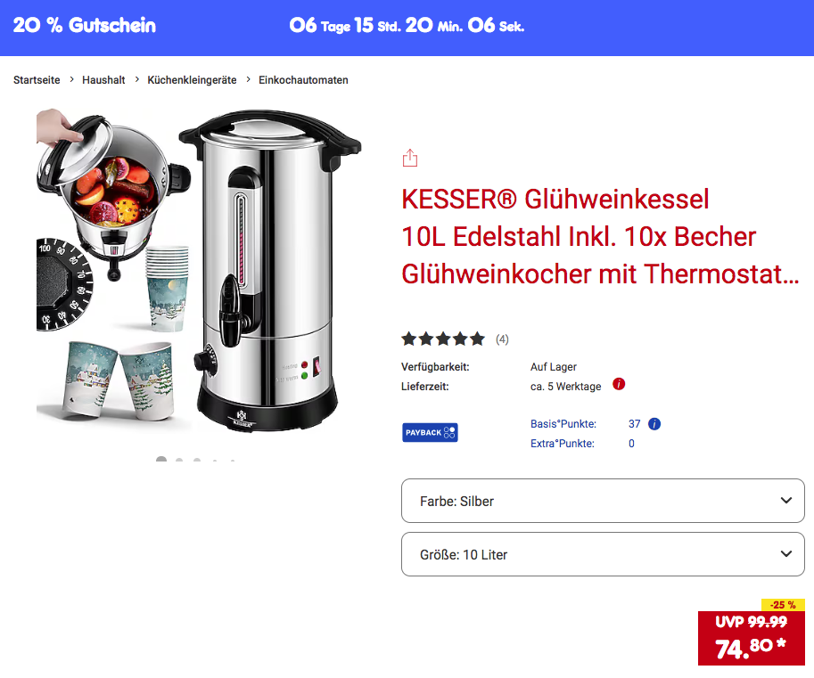 Den KESSER Glühweinkessel 10L Edelstahl inkl. 10x Becher - ein universeller Heißgetränkeautomat für verschiedenste Heißgetränke wie Tee, Glühwein, Punsch usw. - bekommt man im Laufe dieser Aktion für 59,84€ inkl. Versand.