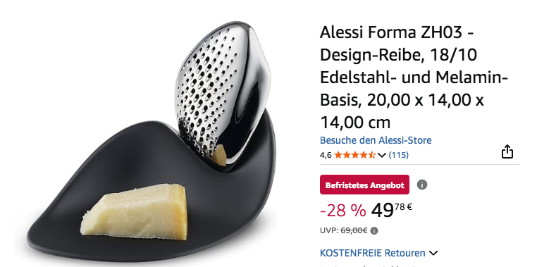 Amazon bietet aktuell die Alessi Forma ZH03 20 cm Design-Reibe für 49,78€ an, solange der Vorrat reicht.