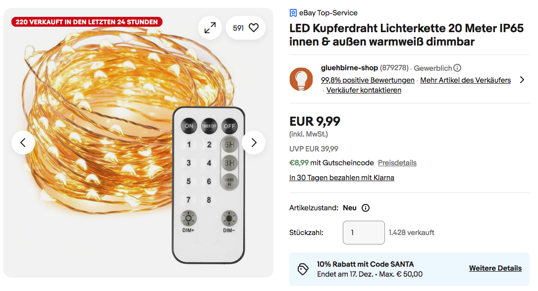 Dank dem Gutscheincode: SANTA (10% Rabatt ausgewählte Technik) bekommt man diese Lichterkette für 8,99€.
