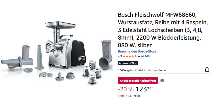Amazon bietet aktuell den Bosch Fleischwolf MFW68660 für 123,99€ an, solange der Vorrat reicht.