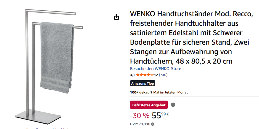Amazon bietet aktuell den WENKO 25379100 Handtuchständer "Recco" aus satiniertem Edelstahl für 55,99€ an, solange der Vorrat reicht.