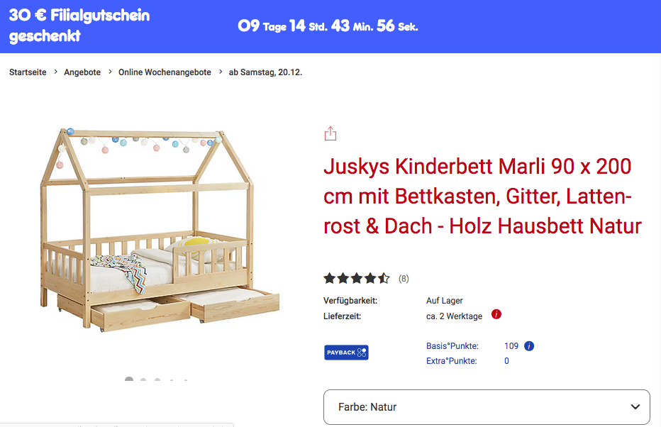 Das Juskys Kinderbett Marli 90 x 200 cm mit Bettkasten, Gitter, Lattenrost & Dach bekommt man im Laufe dieser Aktion für 219,99€ inkl. Versand und 30€ Filial-Gutschein gratis dazu.