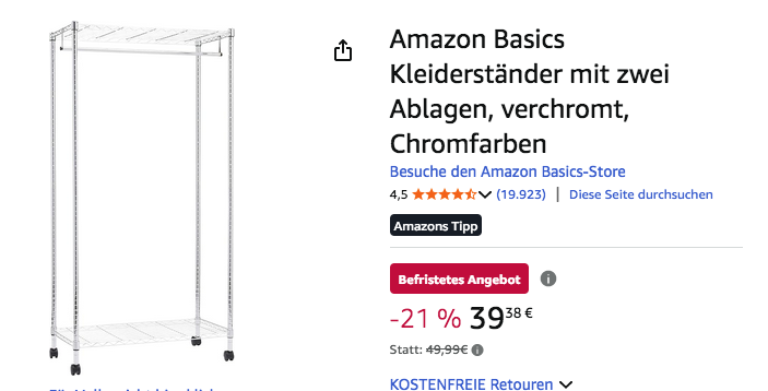 Amazon bietet aktuell den Amazon Basics 89 x 44 x 179 cm Kleiderständer mit zwei Ablagen in Chromfarben für 39,38€ an, solange der Vorrat reicht.