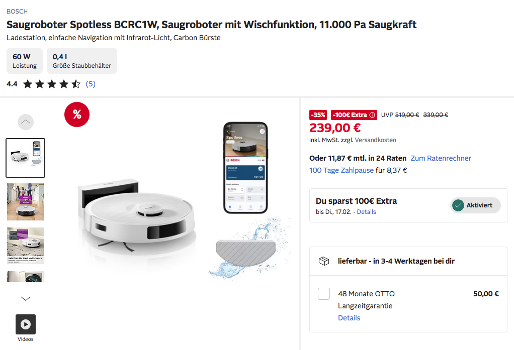 Otto.de - 100 Rabatt auf ausgewählte Hausgeräte: z.B. BOSCH BCRC1W Spotless Saugroboter mit Wischfunktion