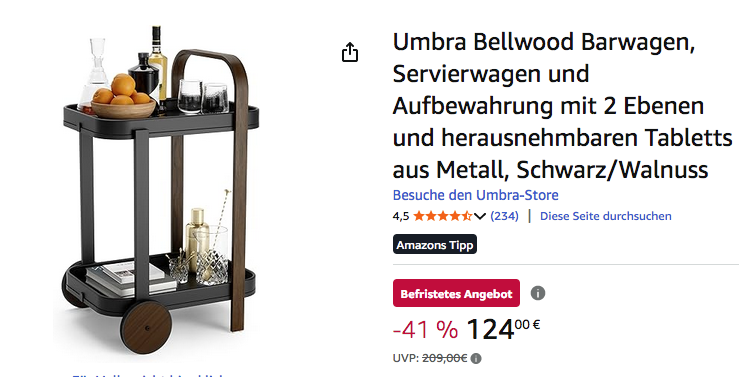 Amazon bietet aktuell den Umbra Bellwood Barwagen in Schwarz/Walnuss für 124€ an, solange der Vorrat reicht.