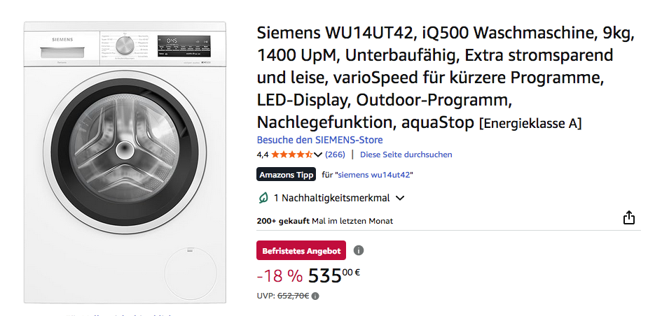 Amazon bietet aktuell die Siemens WU14UT42 iQ500 9kg Waschmaschine für 535€ an, solange der Vorrat reicht.