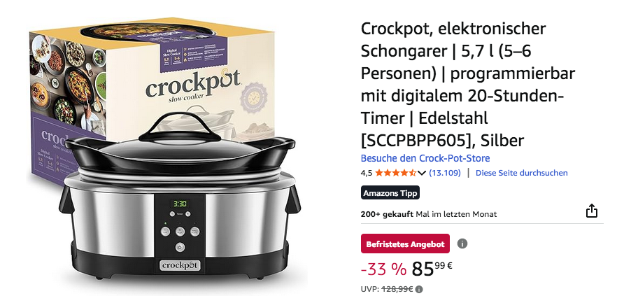 Amazon bietet aktuell den Crock-Pot SCCPBPP605 5,7 l Schongarer für 85,99€ an, solange der Vorrat reicht.